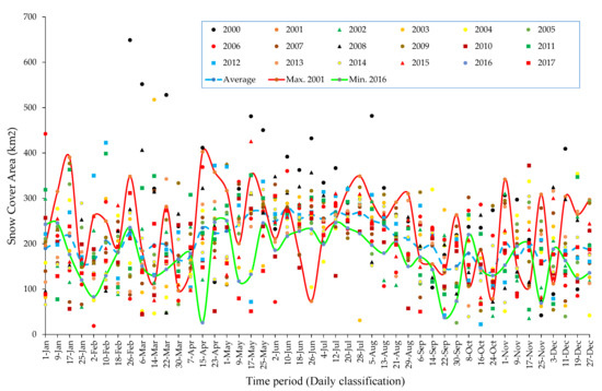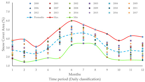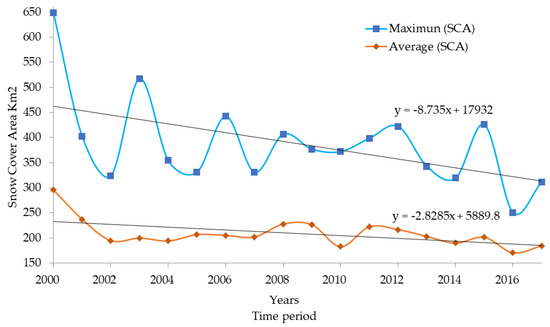 Figure 10. Trend analysis of the snow cover area (SCA) at the Alto Santa sub-basin (2000–2017).