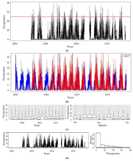 Various statistical methods have been used to analyze the consistency of the 06 stations of 39,420 data points of precipitation, maximum, and minimum daily temperature. The data were divided into groups of three or four stations according to their geographical location (Figure 1). The result (Figure 5) displays the result of the Yanamarey station’s original series with missing and completed data. This figure could show the impact of the data completion process on the Yanamarey station’s time series data, which is essential for ensuring the accuracy and reliability of the data used for analysis. It may be helpful to review the specific results and any associated studies or conclusions to better understand the significance of this station’s data completion process. Most climatological data are non-parametric because they do not have a normal distribution.