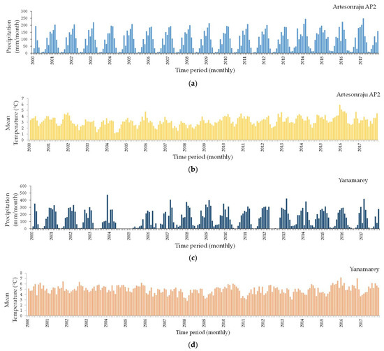Figure 7. (a) Monthly variation of precipitation Artesonraju AP2 station; (b) Monthly variation of mean temperature Artesonraju AP2 station; (c) Monthly variation of precipitation Yanamarey station; (d) Monthly variation of mean temperature Yanamarey station.