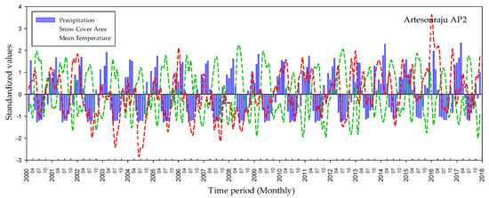 Figure 8. Correlation between standardized values of precipitation, average temperature (Artesonraju AP2), and snow cover area in the Alto Santa sub-basin (2000–2017). All the correlation values are significant, with a significance level of p < 0.05.
