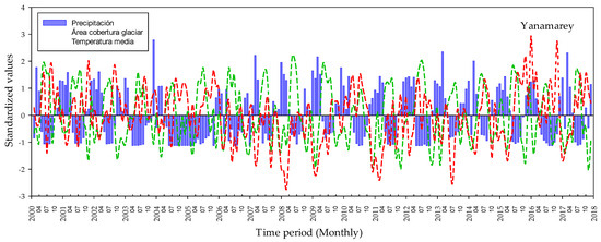 Figure 9. Correlation between standardized values of precipitation, average temperature (Yanamarey), and snow cover area in the Alto Santa sub-basin (2000–2017). All the correlation values are significant, with a significance level of p < 0.05.