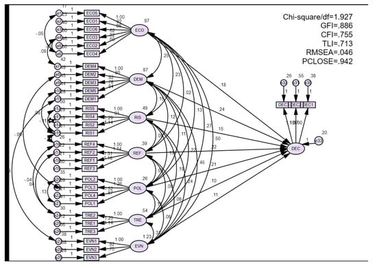 In the regression weight, there are six factors that have p-values less than 0.05, showing that the relationship between the factors in the model is statistically significant. The factor TRE, however, is 0.076 > 0.05, so this factor is not statistically significant (Table 3).