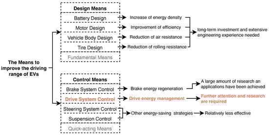Electric vehicles (EVs) are considered to be a significant solution to reduce air pollution caused by the transportation industry due to their zero-emission characteristics [1,2,3]. Meanwhile, EVs are also considered to be the best platform for autonomous vehicles because of their excellent control performance. However, the inadequate driving range of EVs is still a crucial constraint to their development [4]. The means to improve the driving range of EVs can be roughly summarized as design means and control means (Figure 1). The design means mainly refer to the design of the batteries, motors, and body structure of EVs, which are considered to be the fundamental means to increase the driving range of EVs. The control means mainly refer to the control of the vehicle subsystems, such as the braking system, steering system, and active suspension system, which could directly or indirectly reduce the driving energy, and they are generally quick-acting and effective means for improving the driving range of EVs.