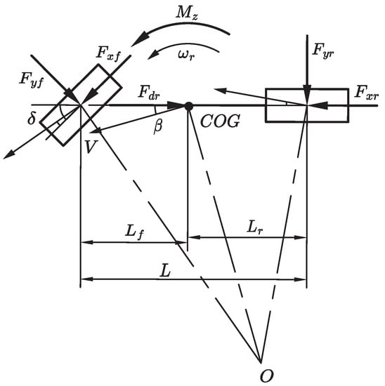 where m is the mass of the vehicle; and are the length from the COG to the front and rear wheel axles, respectively; V is the resultant velocity of longitudinal and lateral velocities; is the steering angle of the front wheels; is the sideslip angle at the COG; is the yaw rate of the vehicle; and are the total longitudinal tire forces of the front and rear axles; and are the total lateral tire forces of the front and rear axles; is the driving resistance; and is the additional yaw moment generated by the distribution of traction torque.