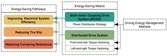 There has been extensive research on driving energy management, but the effectiveness of driving energy management in improving the driving range of EVs has not received sufficient attention, and there are not many applications in mass-produced vehicles. To gain a more systematic understanding of driving energy management and to facilitate the further application of the driving energy management strategy in mass-produced EVs, this review systematically summarizes the various technologies that can be used to improve the driving range of EVs from the perspective of driving energy management; this review focuses on providing a comprehensive summary of the configurations and power distribution strategies for the dual-motor coupling drive system (DCDS) and a systematical summary of energy-saving torque-vectoring control strategies for the decentralized drive system.