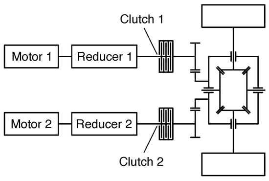 A characteristic of the DTCDS is that its output torque is the linear summation of the output torque of the two motors, and its output speed is proportional to the output speed of the two motors. Based on this characteristic, the efficiency of the DTCDS can be improved by distributing the output torque of the two motors to optimize the working points of each motor [21,22]. For a typical DTCDS, the output ends of the two motors are connected through a specially designed coupler or directly connected to the same element (Figure 6) so that the output torque of the drive system can be transferred freely between the two motors. Moreover, the DTCDS can switch between single-motor driving mode and dual-motor torque-coupling driving mode to reduce the transmission loss caused by the idle rotation of the non-driving motor, which can further improve the energy conservation potential of the DTCDS. This can be achieved through the utilization of clutches and the matching design of mechanical structures such as the reducer and coupler [23]. In addition, since torque coupling is the simplest power coupling pattern, the configuration of the DTCDS can be diverse. Broadly speaking, in addition to the typical DTCDS introduced above, the front-and-rear-independent-drive axle is also a kind of DTCDS.