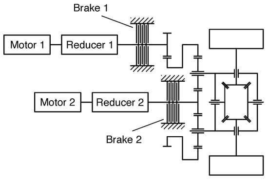 A characteristic of the DSCDS is that its output speed is the linear summation of the output speed of the two motors, and its output torque is proportional to the output torque of the two motors. Based on this characteristic, the DSCDS can flexibly optimize the working points of each motor by distributing the output speed of the two motors so that the efficiency of the DSCDS can be effectively improved. Since a planetary gear system is characterized by multiple degrees of freedom and a linear relationship between the speeds of each component, which fits the coupling requirements of the DSCDS quite well, it becomes the preferred coupler for the DSCDS. In a typical DSCDS, each of the two motors is connected to one of the input ends of a planetary gear system so that the output end of the planetary gear system can deliver the coupled power (Figure 7) [24,25,26,27]. Furthermore, the DSCDS can also switch between single-motor driving mode and dual-motor speed-coupling driving mode to provide more options for transmission ratio selection. This can be achieved through the utilization of brakes and the matching design of mechanical structures [28].