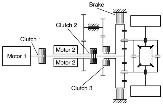 In order to simultaneously achieve the beneficial effects of both the DTCDS and DSCDS, the VDCDS was designed. The VDCDS is capable of switching among various driving modes: single-motor drive, dual-motor torque-coupling drive, and dual-motor speed-coupling drive; this can be achieved through the implementation of complex mechanical structure with clutches, brakes, or some other actuators [29]. In some kinds of VDCDSs, hollow shaft motors are needed to achieve a more compact structure of the drive system and a better arrangement of mechanical components [30]. Figure 8 shows a novel VDCDS configuration proposed in [31], where the output shaft of motor 1 passes through the inner hole of the output shaft of motor 2 to achieve a coaxial arrangement. This VDCDS configuration can achieve four driving modes: motor 1 driving mode, motor 2 driving mode, dual-motor torque-coupling driving mode, and dual-motor speed-coupling driving mode; these can be switched by controlling three clutches and one brake. Through the study of parameter matching and the power distribution strategy, the energy conservation potential of this VDCDS configuration could reach about 10% compared to traditional single-motor drive systems.