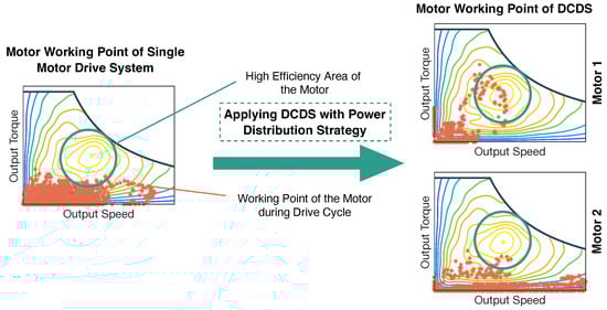 To tap into the energy-saving potential of the MCDS, a power distribution strategy is essential. The primary objective of a power distribution strategy is to optimize the distribution of output power from each motor, which aims to enhance the efficiency of the drive system without compromising its performance. As shown in Figure 9, for the DCDS, the main effect of a power distribution strategy is the optimization of the working points of two motors, resulting in an effective improvement in the load of the motors. This ensures that the working points of the motors can operate more within the high-efficiency area of the motors, thereby improving the driving efficiency of the DCDS.