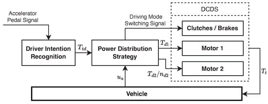 As shown in Figure 10, the main function of the power distribution strategy in the DCDS is to determine the optimal driving mode and the optimal power distribution ratio of the two motors under different working conditions based on the required traction torque and the vehicle speed ; a driving mode switching signal can then be to the clutches or brakes, and an output torque or output speed control signal can be sent to the two motors.