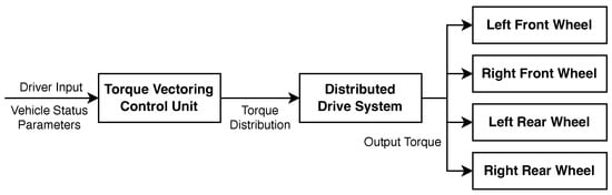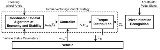 A typical torque-vectoring control strategy is shown in Figure 13 [65,68,69]. Firstly, the total demanded traction torque is determined based on driver intention recognition. Secondly, the demanded yaw rate and demanded sideslip angle of the COG of the vehicle are determined based on a coordinated control algorithm of economy and stability, which is normally based on a reference vehicle model and an optimization algorithm for energy conservation. Then, the demanded additional yaw moment is determined based on a controller. Lastly, the traction torque of each drive motor can be derived based on the torque distribution module. This strategy can effectively enhance the efficiency of the drive system while maintaining the vehicle stability within a reasonable range. Many researchers have proposed better strategies for energy conservation based on this strategy by utilizing advanced control algorithms. Ref. [70] proposed an energy-saving torque-vectoring strategy based on a nonlinear model predictive controller, which concurrently optimizes the reference yaw rate and the torque allocation of each wheel to achieve stable cornering performance with low energy consumption. Ref. [71] developed an energy-efficient torque-vectoring algorithm by combining the experimentally measured efficiency map of the electrical system, the optimization results from a nonlinear quasi-static vehicle model, and drivability requirements for a comfortable and safe cornering response. Simulation results showed that the algorithm achieved over 5% average input power saving in steady-state cornering with lateral acceleration over 3.5 . Ref. [72] proposed a phase-plane-based controller for driving energy management by means of torque vectoring, which adapts to driving situations by optimizing the weights for vehicle maneuverability and stability performance. The controller could effectively balance the handling and stability performance of the vehicle and the energy conservation effect of the drive system. Ref. [73] proposed a deep-reinforcement-learning-based torque distribution strategy in which the torque distribution task is explicitly formulated as a Markov decision process so that the vehicle dynamic characteristics can be approximated, which significantly enhances the real-time executability of the driving energy management strategy.