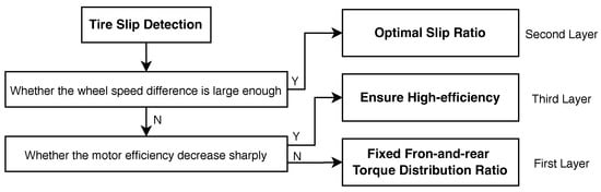 The analysis of tire slip energy dissipation is also an important part of driving energy management by means of front-and-rear torque vectoring. When the slip ratio exceeds the critical value and the tire experiences excessive slip, the slip of the tire can lead to a significant increase in energy dissipation [55]. This situation should be avoided by the control of the drive system. Therefore, some researchers took tire slip energy dissipation into account in driving energy management to achieve a better drive energy conservation effect. Ref. [56] proposed a hierarchical front-and-rear torque-vectoring algorithm (Figure 12), which is composed of three layers. The first layer applies a fixed torque distribution ratio. When the tire slips excessively, the second layer is activated and employs sliding mode control to adjust the slip ratio to the optimal value. If the motor efficiency drops sharply and the vehicle remains within the safety boundary, the third layer is triggered, and the particle swarm optimization algorithm is utilized to search for the optimal torque distribution ratio and maximize the drive system efficiency. Ref. [57] took the variations in road adhesion into account and developed a multi-objective optimal front-and-rear torque-vectoring energy-saving strategy, which combines with anti-slip regulation (ASR) to achieve a better energy conservation effect and eliminate excessive tire slip.