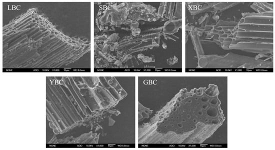 The SEM images of biochar from different plant sources are shown in Figure 1 (magnification: 1000×). Due to the different types of biomasses, there are some differences in the pore structure and the pore size of the biochar. XBC had a larger pore size and a loosely arranged pore structure, and the basic structure was not significantly different. The structure of SBC was similar to that of XBC, but there was a parallel network structure on the pore wall of SBC, while the surface of the pore wall of XBC was smooth and flat, and there was no similar structure. Unlike the honeycomb pore arrangement of XBC, LBC, SBC and YBC, GBC had a large distance between the pore walls, different pore sizes and irregular arrangement.