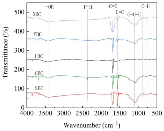 The FTIR spectra of the five biochars are similar to some extent (Figure 2). The strong and broad absorption peak at 3420 cm−1 and the weak absorption peak at 1400 cm−1 are due to the stretching and bending vibrations of hydroxyl (-OH) [5]. It is generally believed that biochar contains lignocellulosic components, and the weak peak at 2360 cm−1 is a vibrational absorption peak of P-H, demonstrating that the biomass surface contains a small amount of phosphorus. The sharp peak at 1685 cm−1 is produced by the stretching vibration of C=O in carboxylic acids or ketones, which may come from carboxylic acid esters or ketones in the biomass [41]. All biochars produced absorption peaks of benzene ring C=C near 1560 cm−1, indicating that the benzene ring in the other four biochars underwent different degrees of rearrangement and condensation reaction or breakage [42]. Bending vibrational peaks of the aromatic ring (C-H) were found near 870 cm−1 and 795 cm−1 [43], and LBC showed several vibrational peaks in this region. The above two absorption peaks indicate that the biochar formed stable aromatic structure during the high temperature pyrolysis. Except for LBC, all the other four biochars produced obvious C-O-C vibrational absorption peaks at 1098 cm−1, while C-O-C was generally present in the main chain of cellulose and hemicellulose, indicating that LBC lost more cellulose and hemicellulose during the carbonization process.
