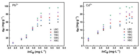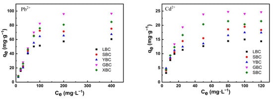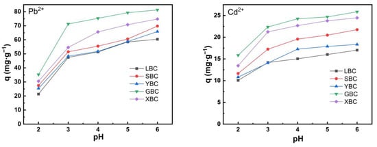 The pH of the solution affects the adsorption of heavy metal ions in the solution by changing the charge distribution on the surface of the biochar [68]. When the solution pH is low, the adsorption sites on the surface of carbon particles are occupied by a large amount of H+, which hinders the approach of Pb2+ and Cd2+, so the unit adsorption amount of Pb2+ and Cd2+ is small. As the pH of the solution increases, the negative charge on the carbon surface increases, and the electrostatic attraction of Pb2+ and Cd2+ increases. It can be seen that the adsorption amount of the five biochars was Pb2+ > Cd2+, the results showed that the presence of a large amount of H+ could inhibit the adsorption of heavy metal ions by the biochar, and the adsorption amount of Pb2+ was less affected by H+ than other ions [69].
