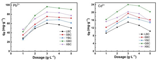 Biochar dosage is one of the significant factors that influences adsorption capacity. According to the data in Figure 5, the unit adsorption capacity of Pb2+ and Cd2+ increased sharply when the dose of the five biochars was less than 3 g·L−1. Then, the dose of the biochar was increased from 3–5 g·L−1 and the unit adsorption capacity of Pb2+ decreased. The best adsorption effect was achieved at an initial dosage rate of 3 g·L−1. Under the influence of the initial dosage, the maximum adsorption of the five biochar species was 96.468 mg·g−1 for Pb2+ and 24.036 mg·g−1 for Cd2+.