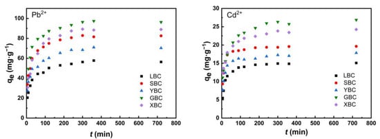 where qt is the amount of biochar absorbed on heavy metals per unit mass (mg·g−1); C0 is the initial concentration of the heavy metal solution (mg·L−1); Ct is the concentration of the heavy metal solution at sampling time T (mg·L−1); V is the volume of the heavy metal solution (L); and m is the dosage of biochar (g).