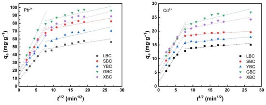 Table 3 and Figure 7 show the intraparticle diffusion results of Pb2+ and Cd2+ on the adsorbents. The whole adsorption process was mainly divided into two stages: the first stage was the process of diffusion of heavy metals to the surface of biochar, and the slope of the fitted line was larger in this stage, indicating that the boundary diffusion process was faster. In the second stage, the slope of the fitted line decreased significantly, indicating that the control step of the adsorption rate of heavy metals by biochar was in this stage. The line did not pass through the origin of the coordinates, indicating that diffusion within the particle was not the only controlling step in the adsorption process [49]. The intercept C2 >> C1 indicating that the effect of the five biochars on Pb2+ and Cd2+ adsorption was greater in the second stage than in the first stage.
