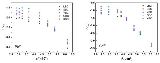The adsorption of the five biochars shows an increasing trend in the D–R model and the Temkin model (Figure 9 and Figure 10). In the D–R model, the process was physical adsorption when the average adsorption energy E < 8 KJ·mol−1, and chemical adsorption when 8 < E < 16 KJ·mol−1 (Table 6). From the fitted parameters of the D–R model, the E values of adsorption of Pb2+ and Cd2+ by the five biochars were greater than 8, indicating that the adsorption behavior was mainly chemical adsorption, and the driving force of the adsorption process was mainly chemical ion exchange adsorption. The fit of the four models was compared, and the Langmuir isothermal adsorption model was the best fit.