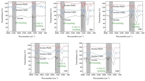The changes in functional groups before and after the adsorption of Pb2+ and Cd2+ on the biochar were determined by infrared spectroscopy (Figure 11). The positions of the peaks before and after the adsorption of Pb2+ and Cd2+ by the five biochars were consistent, and the intensities of the absorption peaks were basically the same, indicating that the biochars have similar adsorption mechanisms for Pb2+ and Cd2+ [52]. Among them, the -OH absorption peaks of SBC, LBC and XBC were significantly narrowed after the adsorption of Pb2+ and Cd2+, and the absorption peaks of all five biochars were shifted to the left, indicating that Pb2+ and Cd2+ occupied the -OH on the surface of the biochar, and it can be involved in complexation reaction [53]. The strong absorption peak of C=O in carboxylic acid or ketone at 1685 cm−1 also changed significantly [1]. The vibrational peaks of the C=C bond and other groups at 1560 cm−1 also changed significantly, and the intensity of the absorption peaks decreased significantly and all shifted to the right, indicating that the π electrons provided by the C=C bond formed a stable structure with heavy metals, and the role of cationic π-bonding in the adsorption process of the two heavy metal ions could be determined [47,54].
