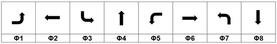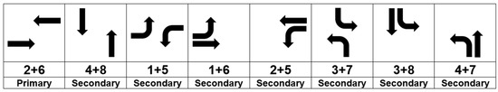 In this study, traffic signal phases are defined based on the Traffic Signal Design Guide and Timing Manual [39] published by the Alabama Department of Transportation (ALDOT). In Figure 3, a standard phase numbering convention is shown for all traffic movements except the right turns. This standardized representation of traffic movements allows convenience in programming, modeling, and calculation of signal control parameters. In the ALDOT manual, standard two-phase, four-phase, and eight-phase operations are described based on traffic demands at a four-way intersection. Eight possible phase combinations of the standard eight-phase directions can be utilized, as shown in Figure 4, for four-way intersections, as the eight-phase operation allows efficient traffic signal control for a given traffic demand. For three-way intersections, three different phase combinations can be utilized, as shown in Figure 5. For each intersection, phase combinations are classified into two types, primary and secondary, as shown in Figure 4 and Figure 5. The combination of 2 + 6 phases is designated as primary, and all the other phase combinations are considered as secondary. The purpose of this classification is to assign a higher priority to the main road than the other side roads since traffic on the main road is responsible for the majority of traffic volume.