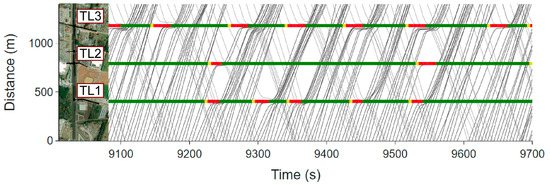 Figure 13, Figure 14, Figure 15, Figure 16 and Figure 17 show time–space diagrams for different controllers. In Figure 13, it can be seen that FFC has regularly spaced signal intervals due to its fixed-time schedule. As a result, a large number of vehicles in both directions are stopped, although the three traffic signals are coordinated to facilitate continuous traffic flow. The traffic flow is greatly improved when proximity sensors are used in ACE to detect vehicles at stop lines to allow actuated coordinated operation of the traffic signals, as shown in Figure 14. When the priority metrics are used to control the traffic signals, the traffic flow is even further improved with few vehicles stopped at the intersections, as shown in Figure 15, Figure 16 and Figure 17. The time–space diagrams for the VCP, VSP, and TSP visually confirm the numerical results shown in Table 5 and Table 6.