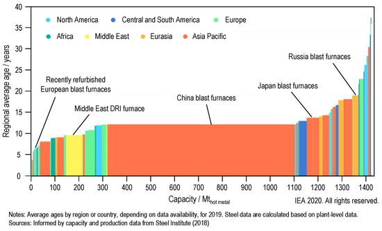 The European Green Deal formulates the ambitious goal of European climate neutrality by the year 2050 [1]. To achieve this goal, measures will have to be taken in energy supply, transport, trade, agriculture, forestry and industry to reduce net emissions of greenhouse gases to zero. Supporting this goal, the steel industry is facing a major transformation [2]. The worldwide steel production of approximately 1875 Mt crude steel in 2019 [3] was mainly achieved via the blast furnace/basic oxygen furnace route (72% [3]) and emitted approximately 2.6 Gt of CO2, which amounts to 7% of the global emissions from the use of fossil fuel [2]. In the medium to long term, production must be converted to low-carbon or zero-carbon processes (e.g., hydrogen-based direct reduction of iron (DRI)), taking into account the boundaries imposed by the existing infrastructure. The rapid growth in production capacity over the last two decades has resulted in a large proportion of steel plants being less than 15 years old [4] (see Figure 1), with most of the European steel plants being even younger. Thus, these plants have not even reached one-third of their typical lifetime and could lead to cumulative emissions of 65 Gt CO2 if operated to their end of life (under current conditions) [2]. This already represents a large portion of the CO2 budget consistent with a sustainable transition for the steel sector. Transitional solutions (e.g., carbon capture, utilization and storage (CCUS) [5]) can be applied in the short term and are therefore needed to lower the climate impact of the existing steelmaking facilities [6].