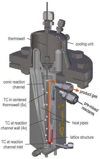Figure 2 shows a CAD section view of the reactor. The premixed reactant gas enters the reactor via welded fittings, flows downwards in a cavity interspersed with a lattice structure and is thereby preheated internally. The gas enters the reaction channel at the bottom of the reactor and then flows up the channel. The reaction channel is filled with semi-commercial catalyst pellets (not displayed in Figure 2). Water-filled heat pipes serve as heat transfer system, which can be actively cooled in the condenser zones by compressed air.