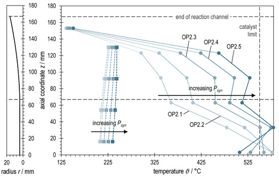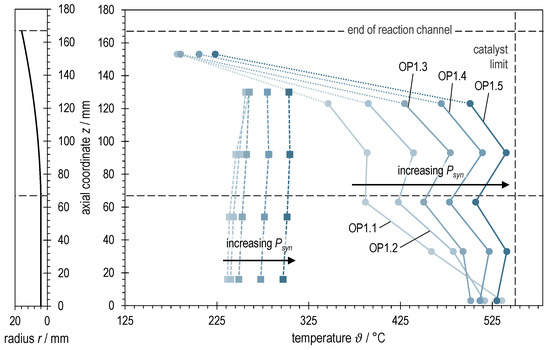 Another striking feature is that the temperature in the center of the reaction channel stabilizes or increases again from measuring point 3 to measuring point 4 after a previous drop. This can be explained by the geometry of the reaction channel. While measuring point 3 is placed shortly before the beginning of the widening, the reaction channel has already widened at measuring point 4. The expansion increases the local residence time and thus the heat release per volume element and at the same time increases the thermal resistance from the center of the catalyst bed to the reaction channel wall. This leads to the observable temperature increase and thus to the desired kinetics-improving effects in the second half of the reactor. Furthermore, the measurements at low syngas powers (OP1.1 and OP1.2) differ in their course from the other curves. The aforementioned have a pronounced hotspot directly at the reactor inlet. Keeping this temperature below 550 °C was decisive for the choice of the control parameters. As the load increases, the temperature profiles become increasingly uniform. Simultaneously, there was a need to avoid a blow-off (transition from ignited to non-ignited state) of the reactor (see also interpretation of Figure 6 and Section 3.4).