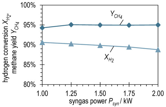 Figure 4 shows the hydrogen conversion and methane yield of the syngas power variation with BFG evaluated according to Equations (6) and (7). is between 90.7 and 93.5%, which is very high for a single-stage reactor concept in once-through operation. As expected, is somewhat lower (85.9–90.7%) due to the over-stoichiometry. The decrease in and with increasing suggests a kinetic limitation during the methanation of BFG in ADDmeth1. Superimposed on this, a second effect can be observed in Figure 4. The mentioned slight increase in the stoichiometric ratio with increasing results in different slopes of and . This means that with an increasing , more H2 remains in the product gas and less is converted.