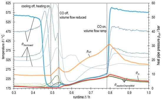 From an approximate runtime 0.445 h, an attempt was made to counteract the blow-off by switching off the active cooling and increasing the trace heating. However, since the reaction front was already too far inside the reactor at this point and the countermeasures had only too small an effect on the reaction channel inlet temperature, the reaction could not be ignited again. As an emergency measure, the highly reactive component CO was switched off, the volume flow was reduced and a restart of the methanation was prepared by means of electrical preheating of the catalyst bed. This was finally finished at a runtime of approximately 0.79 h and the methanation with the desired gas mixture was started again. To prevent another blow-off, a significantly higher heat pipe pressure was chosen, resulting in a higher overall temperature level and a reaction channel inlet temperature of ϑin ≈ 212 °C (at stabilized operating point, as of runtime 1.0 h), which is well above the determined ignition temperature. However, with the conditions set in this way, it was not possible to maintain the catalyst limit of 550 °C. With the parameters selected, the reactor is operated at an impermissible operating point for the catalyst used, resulting in increased deactivation due to sintering processes. This problem could be avoided by selecting a catalyst with a higher permissible temperature.