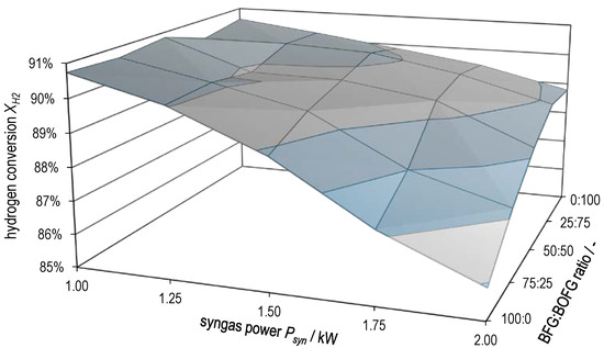 Hydrogen conversion as a function of syngas power and BFG:BOFG ratio.