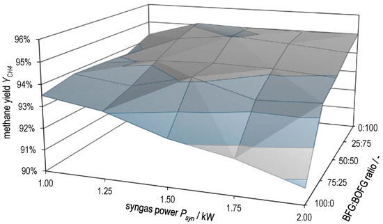 Figure 10 and Figure 11 plot hydrogen conversion and methane yield , respectively, as a function of both syngas power and BFG:BOFG ratio. Here, too, the gradual transition between the characteristics of the two extreme cases already described above becomes clear. and attain the lowest values at high syngas powers with pure BFG methanation. The two surface plots support the statement already made that there is probably a limitation by equilibrium in pure BOFG methanation and that this gradually changes to a limitation by kinetics in the case of pure BFG methanation.