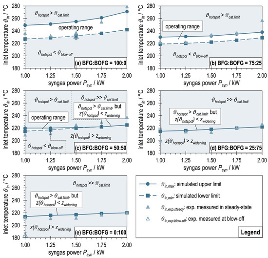 The performed simulations included the 25 steady-state operating points that were also investigated experimentally. Section 2.3 summarizes the corresponding boundary conditions. For each of the described operating points, a variation of in 5 °C steps first determined the ranges relevant for a more detailed specification of the upper and lower limit of the reaction channel inlet temperature. Subsequent, refined simulations of these ranges with finally provided the values for and . In the analysis, the criteria described above were used throughout.