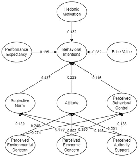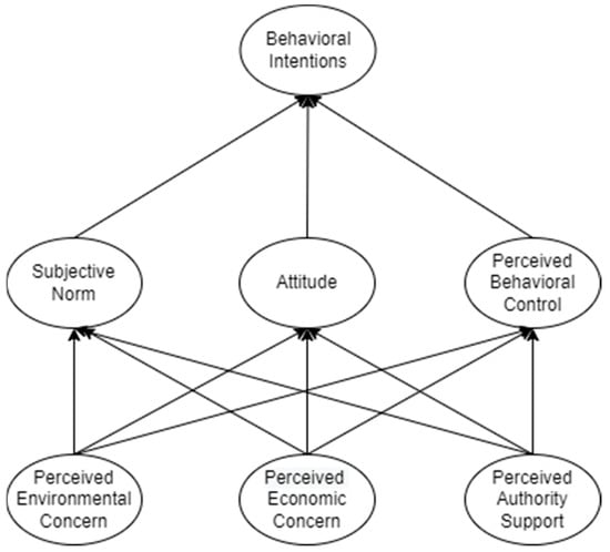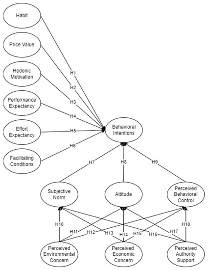 With regard to country development, establishing smart technologies and sustainable aspects, the government can play a large influential role. As explained in the study of German et al. [21], the Philippines have a supportive government with regard to positive sustainable behavior among citizens. For example, the study of Jin and Rainey [43] surveyed government sector employees and showed a positive outcome when incentivized behaviors were presented. This means that the more rewarding and supportive the government is, the more likely people will have positive behaviors on their intended actions. As influential as the government is to the country, Tummers [44] expressed that citizens would change depending on the support given to them by the government. This aspect, therefore, could infer that behaviors of citizens would be affected by the perception of government support. The sustainability theory of planned behavior was considered in this study to promote the holistic measurement of environmental, authority (i.e., societal), and economic concerns with TPB domains, which is hypothesized to affect consumer intention. Therefore, the following were hypothesized: