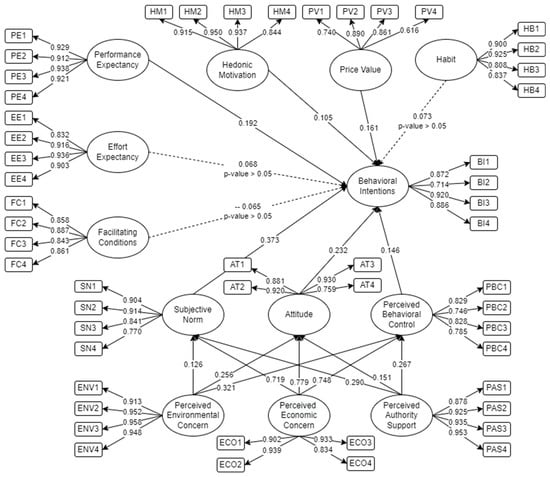 The initial SEM for purchasing intentions of hybrid cars is presented in Figure 3. Following the suggestion of Hair [33], he expounded on the threshold for the direct effect of latent variables. The relationship with p-value greater than 0.05 would be deemed insignificant, which was evident in habit (H1), effort expectancy (H5), and facilitating conditions (H6). In addition, setting a threshold of 0.50 for the measured items was considered [33,58]. From the initial SEM, all items were deemed significant. The detailed initial output of the items and constructs are presented in Appendix B. The factor loading of the initial and final SEM, mean, standard deviation, skewness, kurtosis, and Shapiro–Wilk results are presented. Based on the results, it could be deduced that mean and standard deviation presented acceptable output with positive skewness. This indicates that the right tail was longer and broader, indicating greater mean and median value than the mode [60]. However, the value was within −0.5 and 0.5, which indicates symmetrical results [61]. On the other hand, positive kurtosis indicates a lighter tail compared to normal distribution. As explained [60,61], it pertains to the outlier as a potential, yet it had a less extreme outcome due to the positive values. It presented the positive tail distribution rather than anything else. Justifying the results presents a Shapiro–Wilk value within ±1.96, indicative of a relatively normal distribution [33]. Prior to considering the data collected, Harman’s single factor test for common method bias was calculated. The output presented 33.07%, which is within the threshold of less than 50% [46].