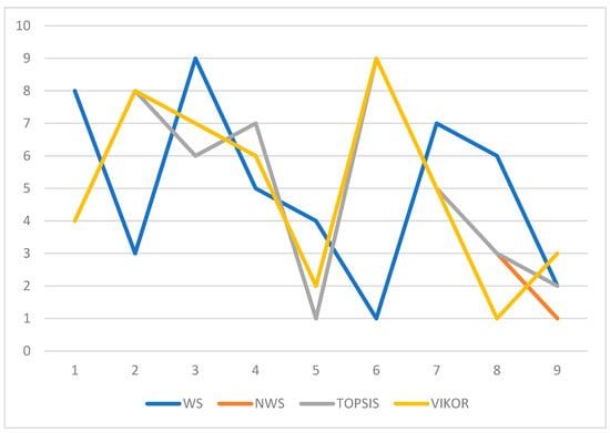 In the WS method, the decision matrix is created in which each element is the value of alternative a, according to criterion o. Then, to be used in the ranking, the value of each alternative was calculated as .
