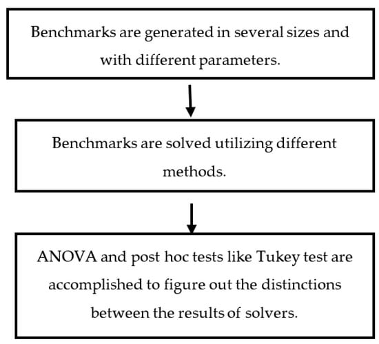 Furthermore, we will enclose more MADM methods in the model and compare them in future studies. Applying the model to a real-world context using empirical data can be a promising avenue for future research. Moreover, the generalizability of our findings was limited by the fact that we conducted experiments using only one benchmark. Thus, future research should incorporate additional benchmarks to further validate the effectiveness of the proposed framework as the parameters used to derive the benchmark affected the results. For example, the value of the v parameter in Equation (28) was defined as equal to 0.5. The reason for this can be explained as follows. The VIKOR method aimed to maximize the group utility and minimize the individual regret. The consensus between these goals was achieved when v = 0.5 [32]. However, for all the parameters, several values should be tested. In addition, statistical methods, such as an analysis of variance (ANOVA) and Tukey’s test, should be performed to detect the differences between the results of the different methods [33]. The possible stages are summarized in Figure 2.