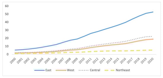 China, as an emerging country with the largest population in the world, has accomplished a key breakthrough in reducing international income inequality. China’s economic development has experienced rapid and stable growth in the past two decades, one of the factors in reducing international inequality [9,10]. As shown in Figure 1, the GDP of different regions, an indicator reflecting regional economic growth, increased from 2000 to 2020. More specifically, economic growth is most obvious in the east, where the GDP has risen tenfold in 20 years. The central and western regions have similar economic growth rates, while the central region has a relatively fast speed. The GDP of the west increased to 222.43 billion yuan in 2020. The economic growth of northeast China is the smallest, increasing from 1.13 billion yuan in 2000 to 5.31 billion yuan in 2020; simultaneously, residents’ income experienced a similar trend. The income of the eastern region occupies a dominant position in the national income, reaching five times that of the northeastern region in 2020. It is worth noting that although residents’ income in the central and western regions has long been at a similar level, the western region surpassed the central region for the first time in 2020.