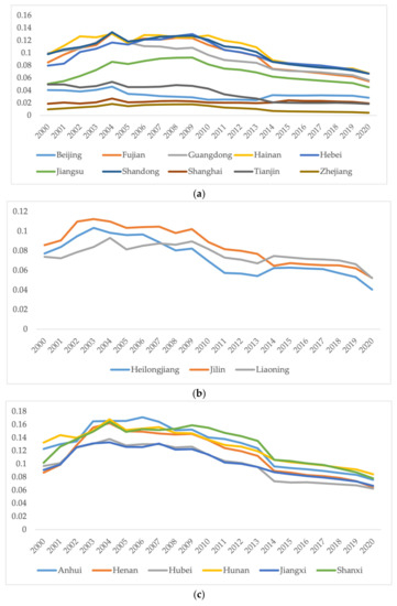 Previous studies in China show that urban bias in policy contributes to the widening regional income disparity, through which regions with a higher urbanization rate benefit more than those with a lower urbanization rate [35,60]. The effect of urbanization on income convergence is the largest in the western region and the weakest in the eastern region. Compared with eastern and central provinces, the urbanization level in the west is relatively low [61]. As the Chinese government accelerates urbanization, the growth rate in the west is obviously faster than that of other regions with a larger base. However, the rural-to-urban migration in northeast China is not obvious because of the serious population loss. This improvement in urbanization is beneficial to increase resident income and reduce the income gap [62,63]. According to our empirical results, the urbanization rate has a significant negative impact on inequality in the eastern, central, and western regions, but the impact is not significant in the northeast region from 2010 to 2019. Therefore, there are positive effects on income convergence of promoting the urbanization of the population—although income inequality between urban and rural areas may be increasing, the share of overall income inequality is decreasing.