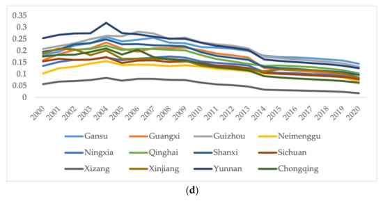 As shown in Figure 5, the change in income inequality in China’s provincial administrative regions, as measured by the Theil index, shows a trend of rising first and then decreasing from 2000 to 2020. Overall, the change in income inequality in the western region is the largest, while that in the eastern and northeastern regions is relatively small.