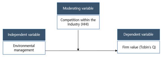 The various activities of the company are affected by an uncertain industrial environment. We considered industry-level factors that could affect the environmental management of companies, because uncertainties in business activities and their predictions are directly affected by external environmental factors [11]. In this study, industry concentration, which refers to the intensity of competition within an industry, is considered to be an industry-level factor that directly affects companies. According to Porter’s theory of industry structure analysis, competition within an industry is an important factor that influences managers’ decision making and determines a company’s profitability [12]. Companies face competition constantly and must create profit by setting strategies that consider the competition factors that affect their industry [13]. Considering the competition within an industry, we verify how environmental management affects a company’s long-term value creation. Therefore, this study focuses on competition within an industry to empirically confirm that corporate performance can vary with the level of environmental management, with the latter being a strategy used to promote the sustainable growth of companies.