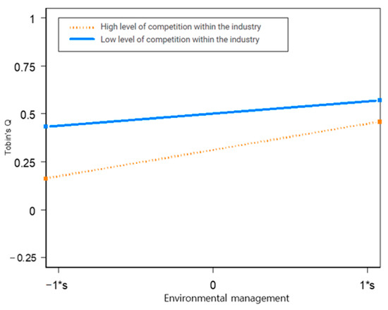 Model 1 was a null model. Model 2 was the result when only the control variable was inputted. Model 3 was the result of Hypothesis 1, which verified the influence of environmental management on corporate performance. The analysis showed that environmental management has a significant positive impact on corporate performance. In other words, when environmental management practices improve, corporate performance also improves significantly. This can be interpreted to mean that a company’s efforts to improve the environment lower the management costs of industrial waste and pollutants, which ultimately improves corporate performance [1,19,20]. Thus, Hypothesis 1 was supported. This supports previous research that argues that corporate environmental management can continuously enhance corporate performance by improving consumer perception and the reputation of a company [38,39,40,41,42]. Model 4 verifies Hypothesis 2 on the moderating effect of industry concentration on the relationship between environmental management and corporate performance. The results show a significantly negative moderating effect (β = −0.074, p < 0.05). In other words, when environmental management increases, corporate performance increases more rapidly in an industry with fiercer competition than in an industry without such competition. Thus, Hypothesis 2 was supported. This also supports previous research showing that a company improves its performance by augmenting stakeholder trust in product credit, value, and quality via active environmental management practices to differentiate itself from competitors [26,27]. Figure 2 illustrates these results.