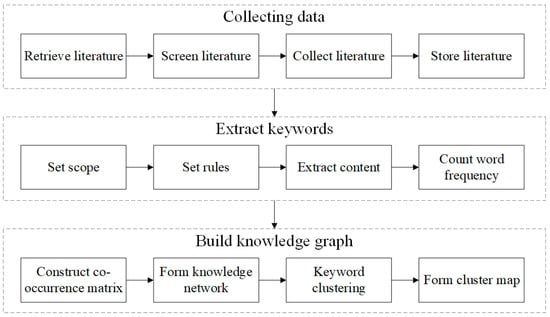 A knowledge graph is a graphical representation of the development and structural relationships of real-world scientific knowledge. It is used to “apply mathematical, statistical, graphical, and information science methods in a combined way to discover, describe, analyze, and ultimately display the interrelationships between textual content in literature. This visualization method is used to display the development history, research status, research hotspots, and frontiers of disciplines” [8]. Figure 1 below shows the thought process and flow of constructing a knowledge graph of Chinese digitalization of archives research. Firstly, literature was searched according to the research topic (digitalization of archives) and other conditions; after relevant literature was retrieved, manual reading and checking confirmed if they met the criteria, and manual screening was conducted to export the required literature citation format, which was then stored. Next, keywords were extracted, and their frequency was counted based on the research timeframe. Finally, a keyword co-occurrence network was constructed for the extracted keywords, and software such as CiteSpace and VOSviewer was used to generate a knowledge graph. Keywords were clustered, and a co-occurring cluster knowledge graph was generated.