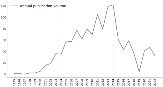 The number of publications on digital archiving in China before October 2022 was collected and plotted to show the annual variation in publication volume (Figure 2). Figure 2 shows that research on digital archiving first appeared in the late 19th century, with an increasing trend followed by a decreasing trend in yearly publication counts. Based on the changes in annual publication volume, the research on digital archiving in China can be roughly divided into three stages: 1995–2004, 2005–2014, and 2015–2022. During the initial stage (1995–2004), the annual publication count was relatively low and always below the average of 47 articles per year, but showed an upward trend each year. The period from 2005–2014 was characterized by rapid growth, during which the total number of publications showed an overall upward trend, with several years (2014, 2013, and 2011) having the highest publication counts. The final stage (2015–2022) was marked by a decline in publication volume, with a gradual decrease in the number of publications each year.