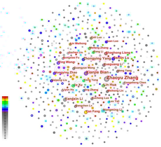 To more intuitively display the collaborative relationships among authors, this study utilized CiteSpace (6.2.1, Copyright (c) 2023 Chaomei Chen) to construct and illustrate a network of author collaborations from 1995 to 2022 (see Figure 3).