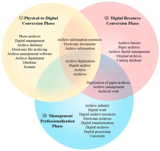 To facilitate the comparison of characteristics across the three stages, we sorted the high-frequency keywords in each stage and created a Venn diagram. From Figure 4, it can be seen that “archive digitization”, “digital archive”, “archive”, and “archives” are the common high-frequency keywords across all three stages. Excluding the common keywords, the first and second stages share the keywords “archive information resources”, “electronic documents”, and “archival information”; the second and third stages share the keywords “digitization of paper archives”, “archive management”, and “archival work”; while there were no shared keywords between the third and first stages, indicating a significant shift in research focus over time. The second stage (2005–2014) introduced new keywords, such as “digitization of paper archives”, “archive management”, and “archival work”, compared to the first stage (1995–2004). The third stage (2015–2022) introduced new keywords such as “archive industry”, “digital work”, and “digital transformation”, compared to the second stage (2005–2014). Overall, archive, electronic files, digitization of paper archives, and archival management have consistently been the focus of research in the field of digital archiving, as evidenced by the high-frequency keywords across the three stages from 2009–2021.