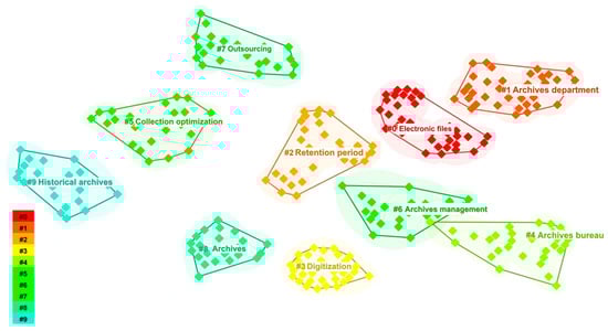 To further explore the hot topics in digital archival research, this study utilized CiteSpace software to generate a keyword clustering map, as shown in Figure 6. The specific operational process involved setting parameters in CiteSpace. Firstly, the time range was set from 1995 to 2022, with yearly intervals for time slicing. Secondly, network pruning was conducted using the Pathfinder algorithm, then Pruning Sliced Network, and finally Pruning The Merged Network, to prevent an overly large network structure. Finally, the LLR algorithm (log-likelihood ratio) was used to generate the co-occurrence clustering map of keywords, as shown in Figure 5. In the map, S = 0.9604 (silhouette coefficient), Q = 0.872 (modularity). A Q value greater than 0.3 (empirical value) indicates that the category structure is significant, while an S value greater than 0.7 means that the clustering is efficient and convincing [23]. As CiteSpace cannot automatically generate the optimal number of categories, manual reading was applied to determine that 10 categories resulted in the best effect, with large differences between different themes and high similarity among keywords within the same theme. Thus, the software automatically generated 10 major clusters which displayed the top hot topics in digital archival research. Generally, the order of the clusters reflects the popularity of the corresponding topic. From the figure, these topics are: #0 Electronic files; #1 Archives Department; #2 Retention Period; #3 Digitalization; #4 Archives Bureau; #5 Collection Optimization; #6 Archives Management; #7 Outsourcing; #8 Archives; #9 Historical Archives. For ease of analysis, this study extracted information on each cluster, which is presented in Table 5.