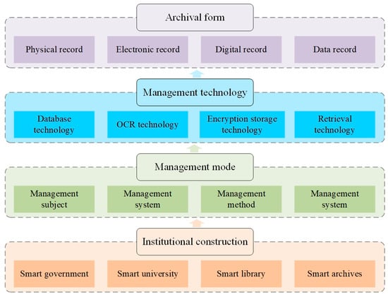 Management technologies provide the impetus for archival digitization. The research and application of scientific and technological advances, such as big data, cloud computing, and artificial intelligence, provide the most fundamental and lasting driving force for the development of archival digitization and are promoting human society to usher in the “intelligent +” era of human–machine collaboration, cross-border integration, co-creation, and sharing. "Intelligence + archives" means applying stronger, high-tech technologies to archival management work, to optimize the business links of the archival collection, collation, storage, retrieval, and utilization and continuously improve the intelligence level of archival management [30]. Currently, China’s practice of intelligent management of archival mainly focuses on two aspects. The first is the establishment of intelligent archival warehouses, including intelligent archival dense shelves with physical archive management as the core, and intelligent control of archival warehouse environment and security [31,32]. The second is the intelligent integration of archival information content using digital technology, including intelligent detection of archival digitization results [33], intelligent conversion of archival information [6], and automation control of some business links of electronic file archiving and collation [34], thus improving the efficiency and level of archival management.