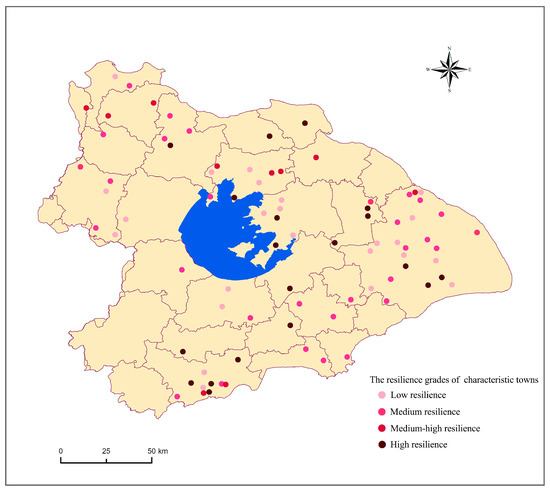 - The number of characteristic towns with moderate resilience is the largest, accounting for 36.1%, while those of high resilience and low resilience account for 22.9% and 28.9%, respectively. Spatially, the characteristic towns with medium–high and high levels are mainly concentrated in Hangzhou, Kunshan, Wuxi, and Shanghai. In terms of the industry type, the resilience level of tourism towns, digital economy towns, and modern service towns with distinctive industrial characteristics is higher;